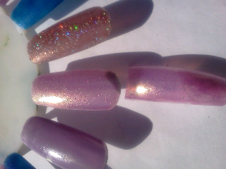 | Wet n Wild unnamed blurple, sandwiched between pastel purple and Orly Fowl Play, sunlight |